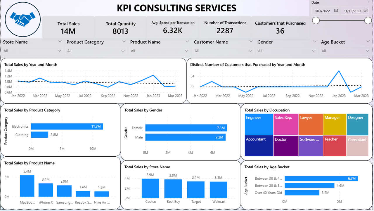 This Power BI project showcases a complete sales analytics dashboard created by a fictional consulting company called KPI Consulting Services.